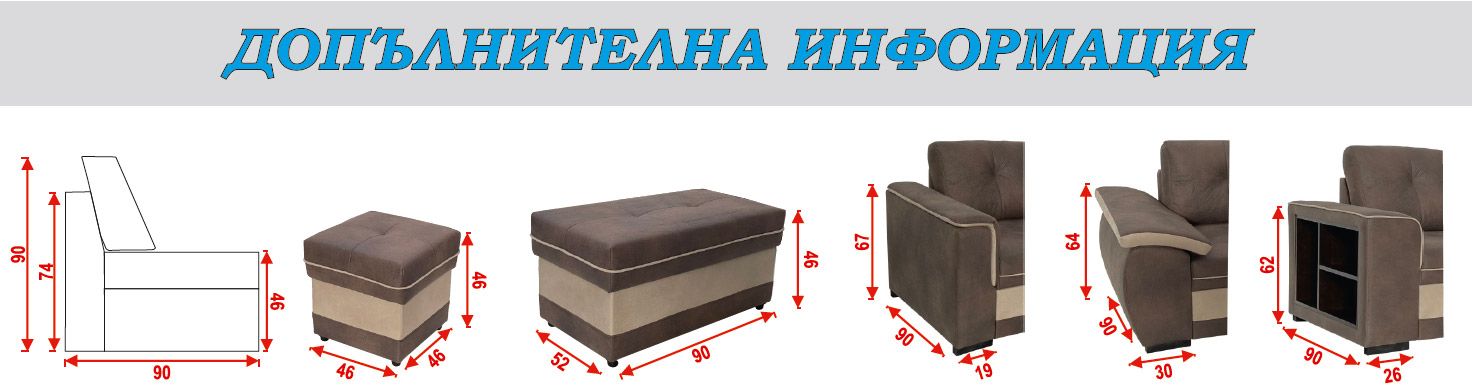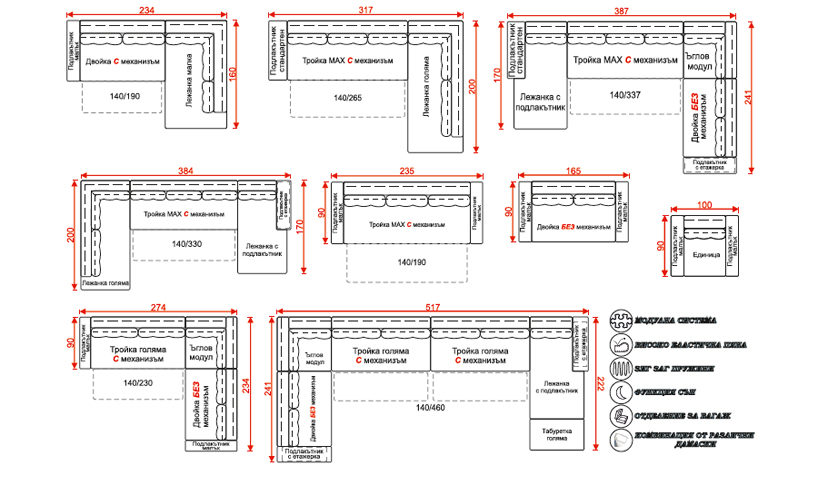Седалищната част е изработена от масивна дървесина зиг-загообразни метални арматури с пружиниращ ефект върху които е поставена 12 см високоеластична пяна. Възглавниците са с цип и пълнеж от силиконов пух. Различните модули имат възможност да превърнат дивана в удобна спалня и разполагат с пространство тип ракла.
