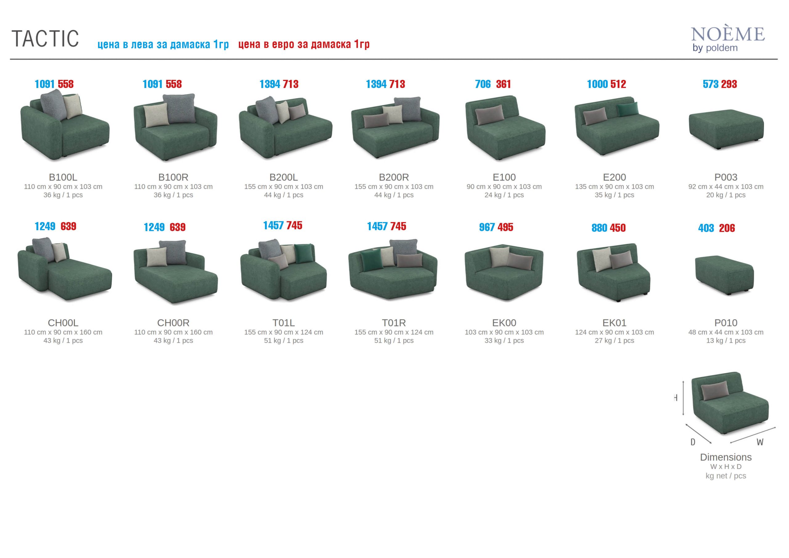 Модулния диван Tactic – гъвкав, стилен и удобен, той ви позволява да оформите своя хол според настроението и нуждите си. Разнообразието от модули ви дава свободата да размествате, разширявате и персонализирате дивана по ваш вкус.