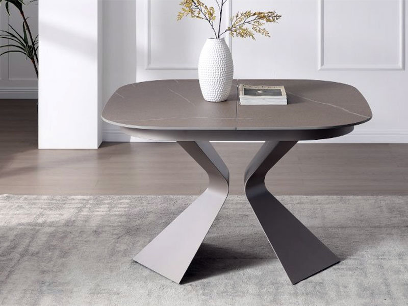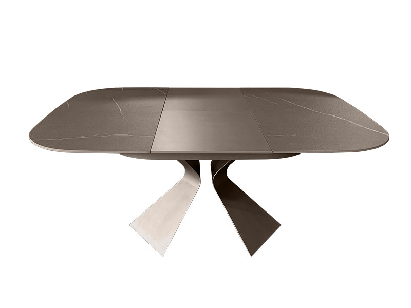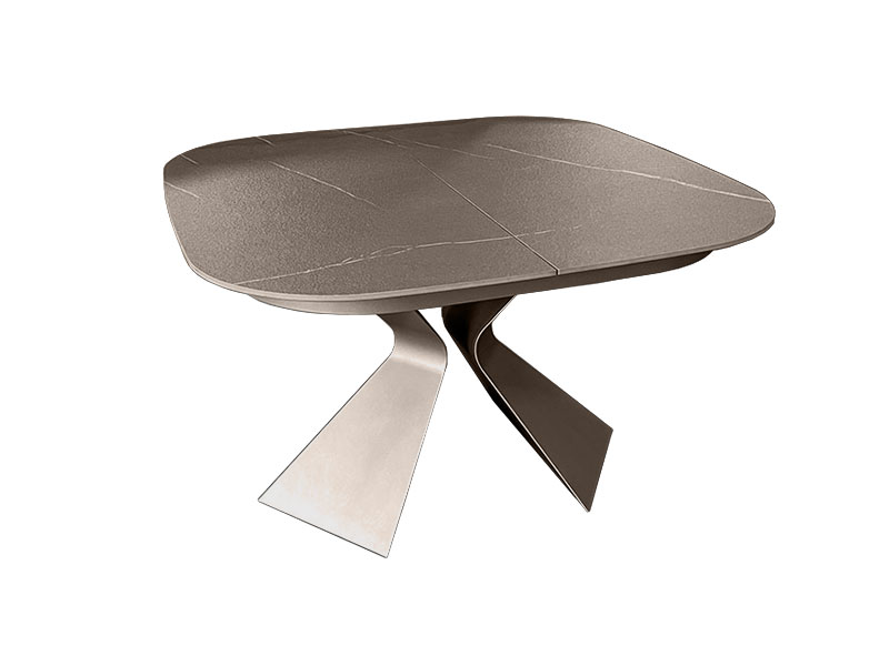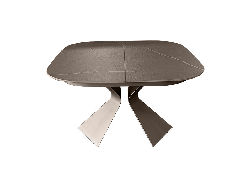 Стилна и модерна разтегателна квадратна маса с керамичен плот в имитация на кафяв камък и метална основа в цвят бронз. Разтегателните елементи са изработени от MDF. Керамичният плот е изключително устойчив на механични повреди, високи температури и влага, а металната основа осигурява допълнителна стабилност и здравина. В сгънато състояние масата е квадратна със заоблени ръбове и размер 120 см. При разтягане дължината ѝ се увеличава с 50 см, достигайки 170 см. Подходяща е за до осем души в затворено състояние и до десет в разтегнато.