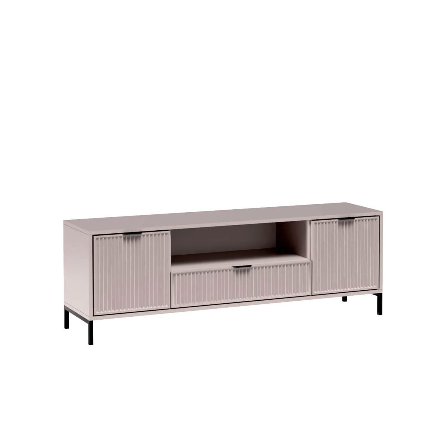 Модерен ТВ шкаф с дизайнерско покритие Средната част представлява практичен рафт за приемник или друго RTV оборудване, под което има голямо чекмедже за различни дребни вещи. Отстрани има два шкафа за допълнителни неща. Шкафът, в комбинация с други мебели в хола, ще създаде красив интериор. Предлага се в два цвята – кашмир/черно индиго.
