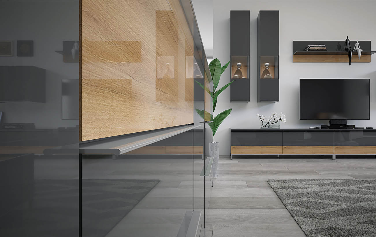 Видимите части на елемента са UV лакирани в супер гланц в атрактивен цвят антрацит с апликация в дървесен декор тихоокеански орех