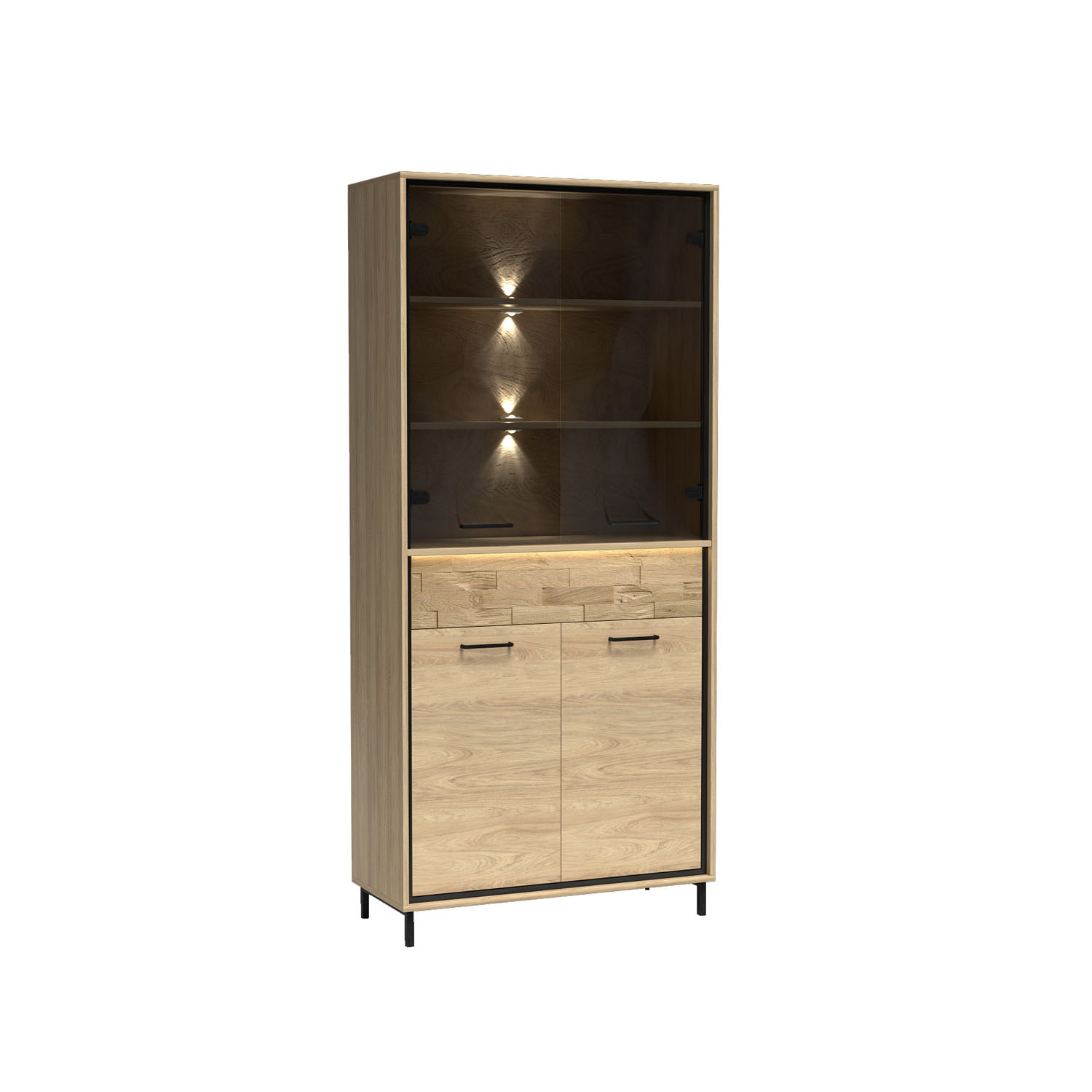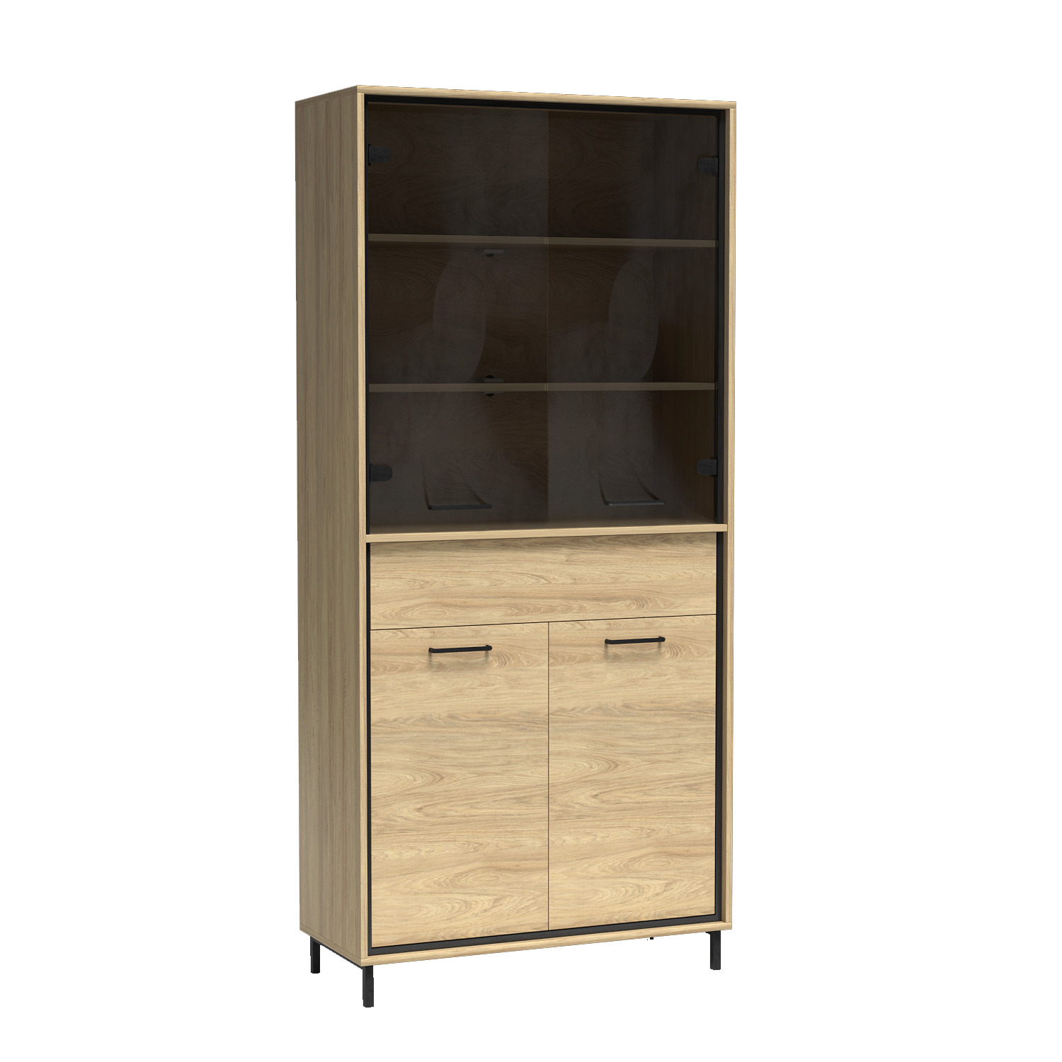 Мислите ли какви мебели бихте искали да поставите в трапезарията? Витрина от колекция MEDIOLAN в естествен цвят на хикори. Комбинация от шкаф с две врати в долната част на мебелите и стъклена витрина в горната част. Мебелта се вписва идеално в помещения като трапезария, офис или всекидневна. В трапезарията ще изпъкне идеално със сервиза ви, когато изберем опцията за осветяване на рафтовете. Артикулът се вписва в модерния индустриален стил. Горната част на гардероба се състои от двойни фронтове от опушено, закалено стъкло и два рафта от ламинирана плоскост. Дъното на витрината е от светли фронтове с черни метални дръжки, зад които имаме рафт. Над долния шкаф има изтеглящо се чекмедже, което се отваря с докосване. Тук е използвана модерна система за отваряне push to open. Можете да използвате допълнителни аксесоари, като черни крака, които ще паснат на черните ленти и ще създадат перфектна комбинация. Предната част на чекмеджето може да бъде декорирана с дървена, дъбова дъска. За по-добър ефект можем да използваме LED осветление за стъклените рафтове и декоративната дъска.