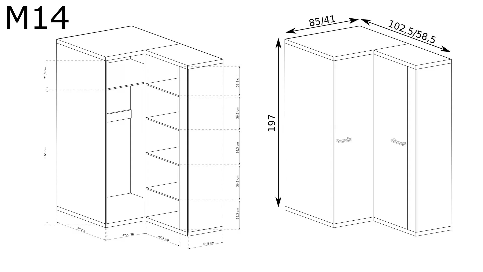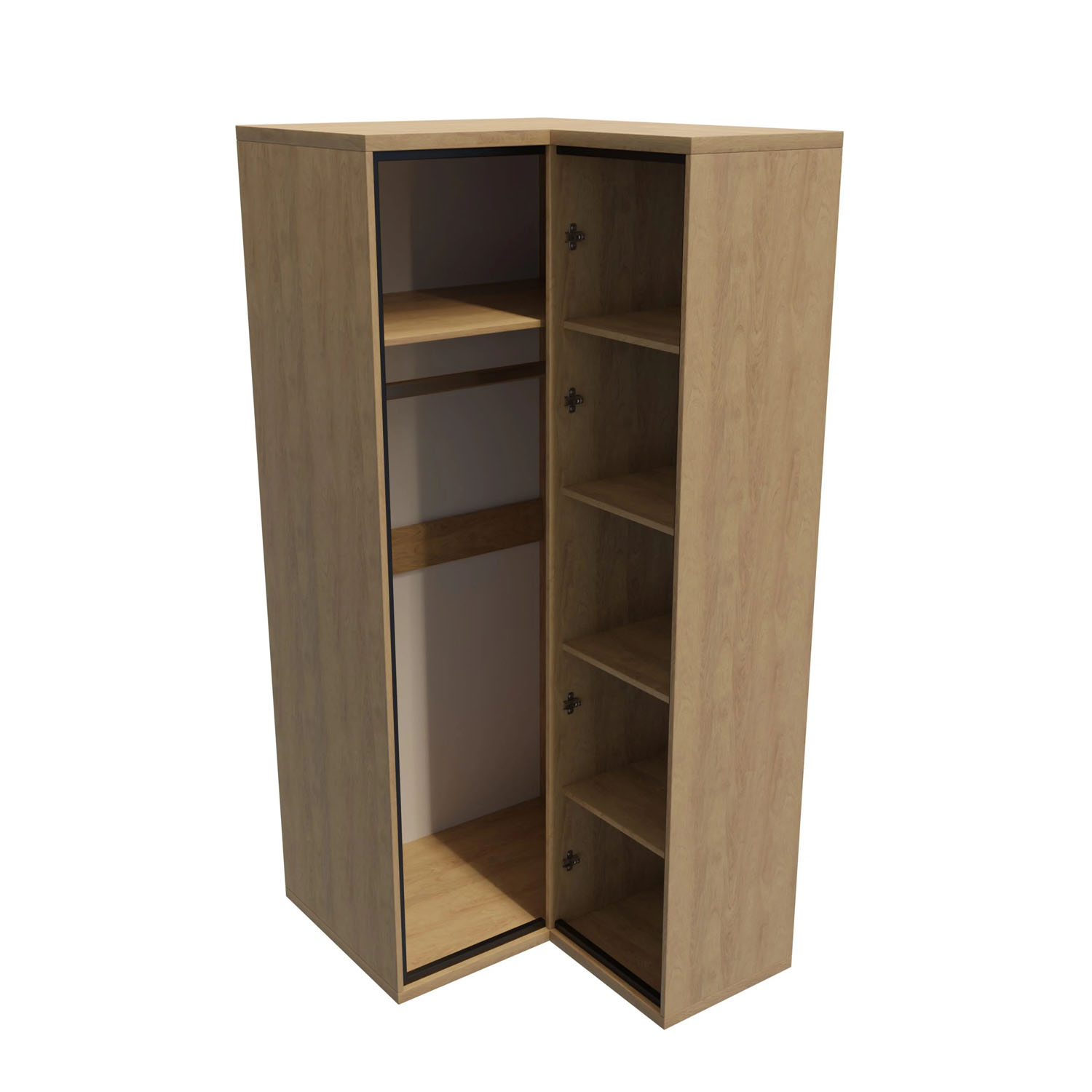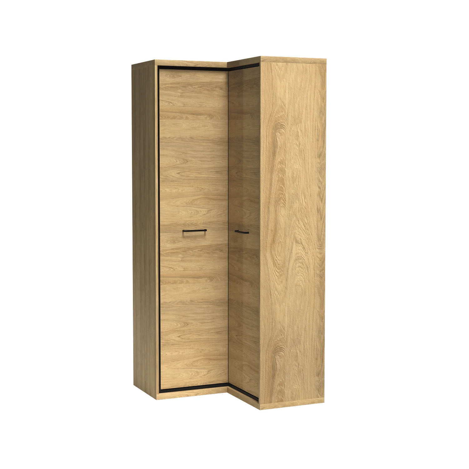 Ъглов, просторен гардероб с две врати и дръжки, за съхранение на дрехи. Благодарение на възможността за допълнителни рафтове можем да спечелим много място. Рядко решение за гардероби. Вътре тази мебел разполага с лост за дрехи и рафт над нея. Гардеробът е идеален за попълване на неизползваното пространство в стаята. Цветът на естественото дърво и тъмните декоративни лайсни в стил loft правят интериора по-топъл.